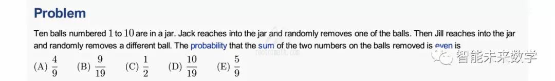 题目翻译如下:瓶子里面有编过1-10号的10个球,Jack同学随机的取出一个球,然后Jill同学再随机的取出另外一个球。两个同学取出的球号加起来是偶数的概率是多少?