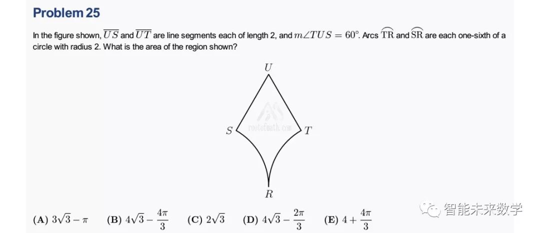题目翻译如下:上图中US和UT的长度为2,∠SUT=60度,弧度TR和弧度SR都是边长为2的圆的六分之一圆周,求UTRS围住的面积。