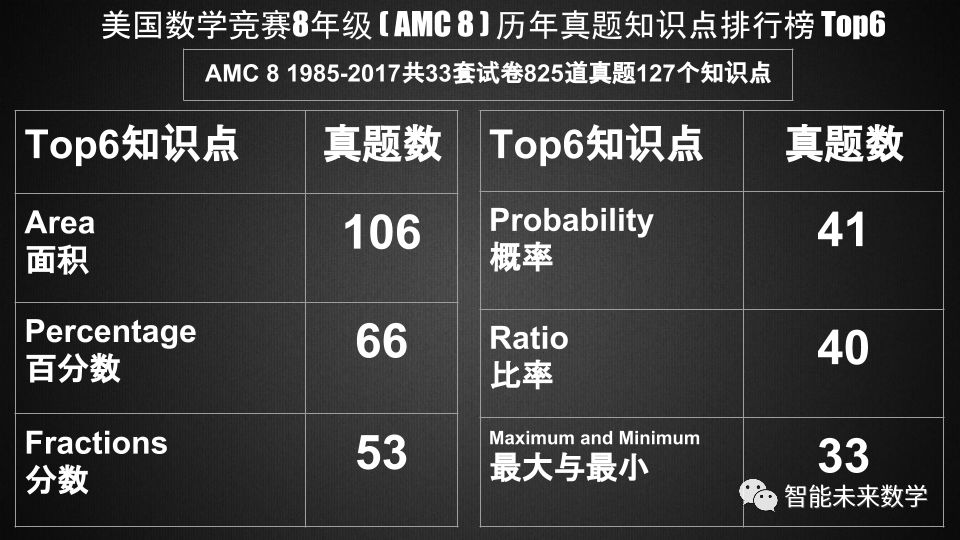 需要指出的是在AMC 8中,充斥了大量的百分数与表格、图形相结合的题目,在真题数量上仅次于几何面积题。这反映了AMC 8与日常应用、未来职场数据分析的需求还是结合得比较好的。