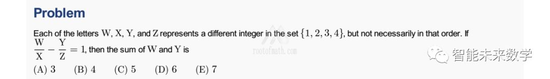 题目原文翻译如下:W,X,Y,Z代表集合{1,2,3,4}里面的四个不同的数,但顺序不一定对应,如果W/X-Y/Z=1,那么W+Y=?